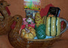 Fall/Thanksgiving Gift Basket. This Turkey Basket contains a ceramic leaf plate, Gourd Salt & Pepper Shakers (designs may vary), Harvest Spice Hot Chocolate, Chocolate Turkey, Ceramic Mug, Fall Pasta, and a candle with matches (Candles vary depening on availability), Fruit Dip Mix and Spreader. This is the perfect hostess gift... -