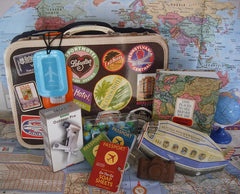 Passport to Style.This Vintage Travel Bag contains the perfect variety of items or a Retirement gift, Bon Voyage or for anyone traveling this journey we call life. The recipient will receive a copy of 1,000 Places to See Before You Die, Luggage Tag, Plastic suitcase with chocolate earth balls, Passport Soap (or variation of dry soap sheets), Cardboard Airplane with cookies, 5-in-1 compass tool, and a chocolate camera image on a candy bar (chocolate camera in photo has been updated).